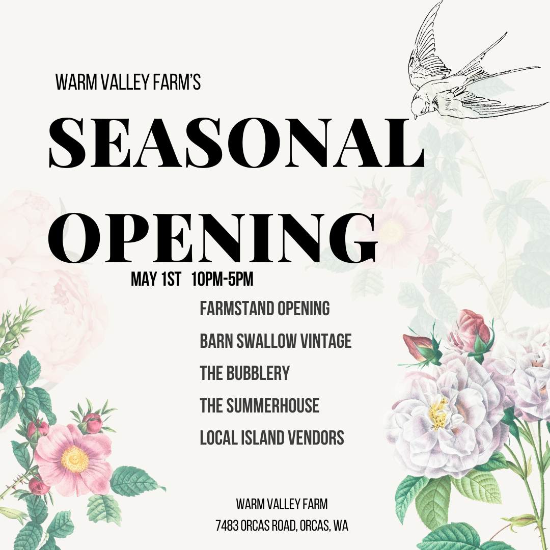 Cradled in the first valley you travel through towards the village of Eastsound, Warm Valley Farm holds a place of bountiful agricultural history on Orcas Island. As stewards, we are committed to organic and regenerative farming practices. We offer exquisite seasonal produce, beautiful cut flowers, heirloom fruit, delicious eggs, and grass-fed lamb. Please visit our Farmstand and Barn Swallow Vintage shop to learn and taste more. Learn more about the farm →